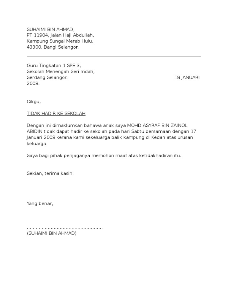 Contoh surat ini boleh digunakan samada untuk anak jagaan saya tidak dapat hadir ke sekolah atas sebab tidak sihat atau anak saya tidak dapat menghadirkan diri ke sekolah disebabkan balik kampung kerana urusan keluarga. Kandungan surat kandungan surat mestilah mempunyai beberapa perenggan yang mejelaskan mengenai tujuan surat tersebut dihantar. 28 june 2010 cikgu, tidak hadir ke sekolah dengan ini dimaklumkan bahawa anak saya ahmad aizat tidak dapat hadir ke sekolah pada hari jumaat bersamaan dengan 25 june 2010 kerana kami sekeluarga balik kampung di kedah atas urusan keluarga. Anak saya tidak dapat hadir ke sekolah pada tarikh berkenaan kerana pulang ke kampung 2 hari awal untuk menyabut hari perayaan. Anak saya tidak dapat hadir ke sekolah pada tarikh berkenaan kerana pulang ke kampung 2 hari awal untuk menyabut hari perayaan.