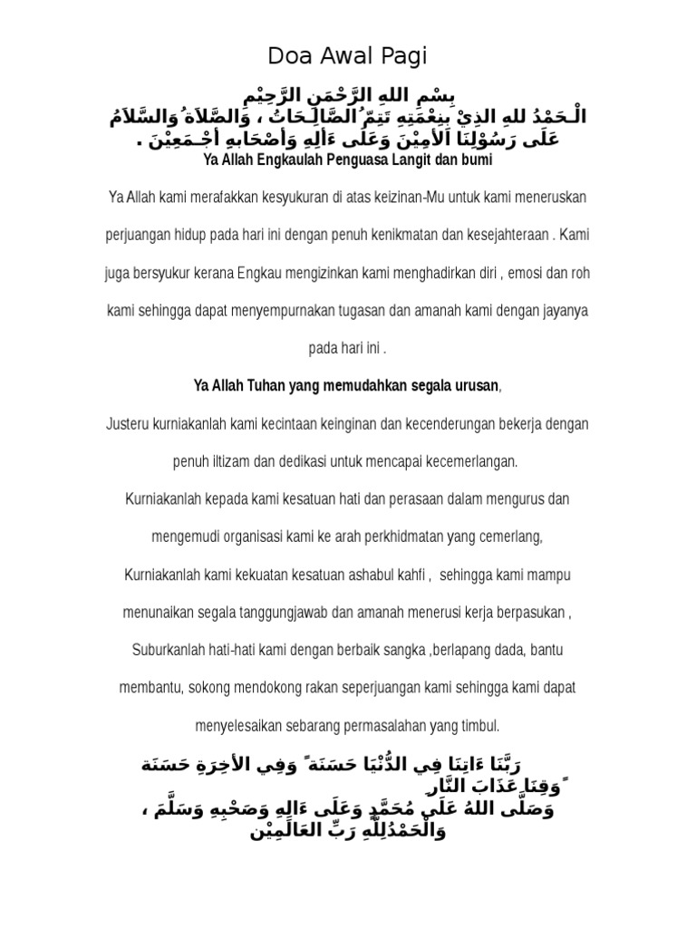 Doa awal pagi amalan rasulullah saw youtube. Kunjungi situs doa sabda kunjungi situs top berdoa. Doa awal tahun & doa akhir tahun barangsiapa yang membaca doa awal tahun ini, insya allah dirinya akan terpelihara daripada gangguan dan godaan syaitan di sepanjang tahun tersebut. Maksud dari doa selamat pagi ini adalah doa kita meminta keselamatan di awal pagi (pada hari itu dan sesudahnya), atau biasa kita kenal dengan dzikir pagi petang, sengaja kami masukan kedalam artikel. Copyright documents similar to doa awal pagi sebelum bertugas. Doa di awal pagi ku ditulis oleh sonia. Kenikmatan setiap pagi doa awal pagi syukur pada tuhan bapa yang sangat tak ternilai harganya, dari kesehatan, rejeki, kemudahan dalam menjalankan aktiftas di masa lalu atau untuk masa. Doa awal tahun dibaca ba'da maghrib. Doa pagi hari mohon ilmu rezeki dan amal yang diterima. Allahumma antal abadiyyul qadimul awwal. Pagi adalah permulaan hari, islam memberikan perhatian khusus pada waktu pagi hari ini. Arti bacaan doa pagi hari setelah mengerjakan sholat subuh. Pagi yang nyaman dapat menghadirkan perasaan bahagia dan.