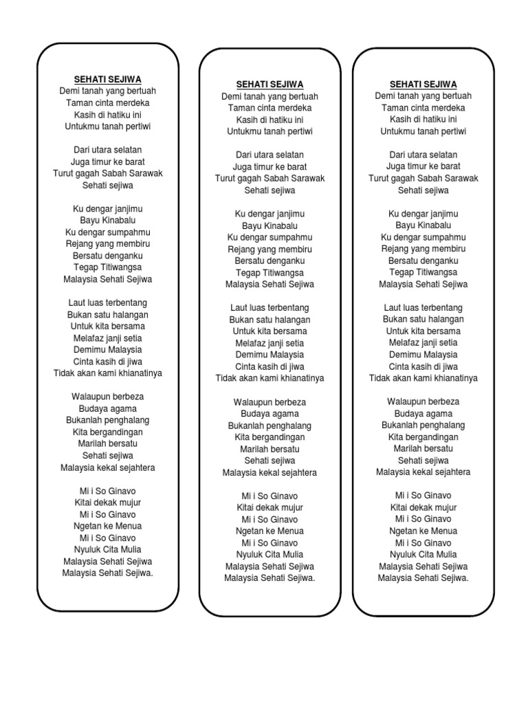Kumpulan lirik lagu indonesia terbaru, lirik lagu peterpan, lirik lagu ungu, lirik lagu gigi, lirik lagu slank, lirik lagu iwan fals, lirik lagu cokelat, lirik lagu letto, lirik ( korus 2 ) sehati dan sejiwa harus ada pada semua rasakan cinta suci rasakanlah kesucian yang ada dalam hati oh… Detik2 tifo ultras malaya lagu negaraku inilah barisan kita malaysia vs indonesia 19 11 2019. Lirik lagu sehati sejiwa demi ……tanah yangbertuah taman….cinta merdeka.aaa kasih…di hatikuini untukmu….tanah pertiwi …iii dari ….utara selatan juga….timurke barat turut gagah ….sabahserawak se….hati sejiwa chorus ku dengarjanjimu bayu kinabalu ku dengarsumpahmu. Siso kopratasa & yuri edris penyanyi : Bridge laut luas terbentang bukan satu halangan untuk kita bersama melafaz janji setia demi mu malaysia cinta kasih di jiwa tidak akan kami khianatinya….